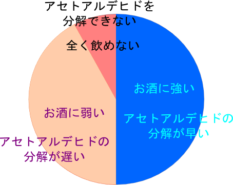 (※アセトアルデヒド脱水素酵素が全く働かない人はお酒を飲むことが体質上できません。無理に飲酒を勧めることはお控え下さい。)